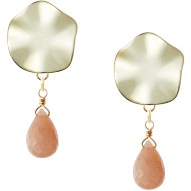 10月の誕生石「オレンジムーンストーン」は、優しさや癒し、女性性を高めると言われる天然石。ニュアンスのあるやわらかな光を放つドロップカットが、揺れるたびに耳元に上品な彩りを添えます。波打つようなデザインが美しい変形ゴールドプレートと組み合わせることで、エレガントかつモダンな印象に仕上げました。落ち着いた秋色がコーディネートを引き立てる、季節感のあるアクセサリーです。