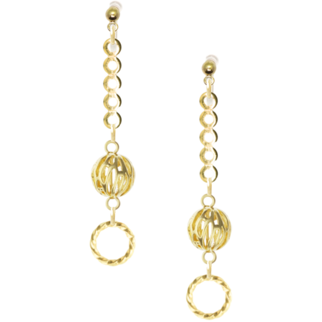 繊細なゴールドの透かしデザインボールと、ツイスト加工の丸カンが揺れる、上品な存在感のノンホールピアス。